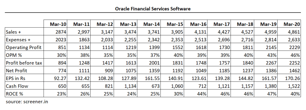 At the current price of ₹3050 , the earnings yield is 8.9% based on pre-tax earnings to market cap, and the dividend yield is 5.8%. Historically, OFSS traded above P/E of 20x, and the current P/E is 16x.