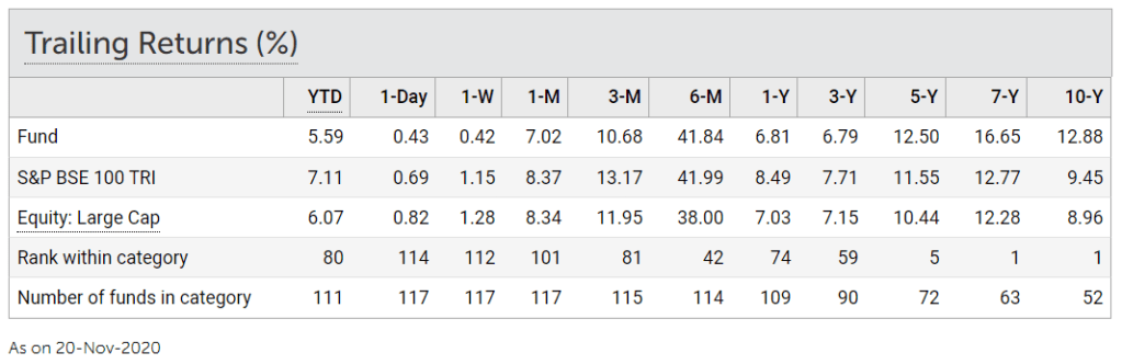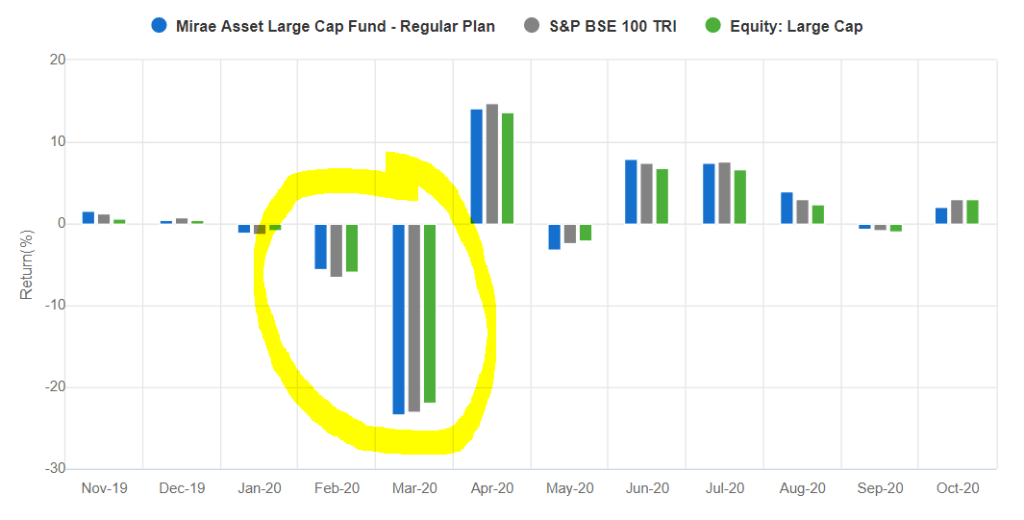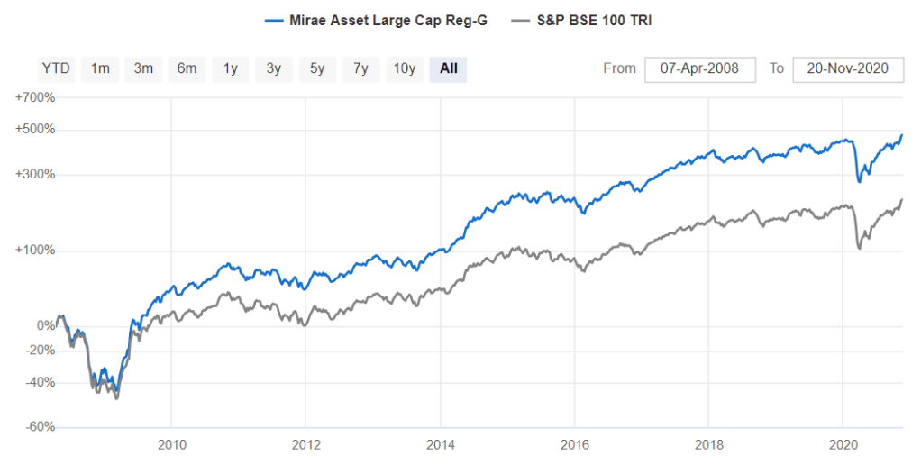 I look at the fund performance for at least 10 years. Mirae Asset Large Cap Fund has outperformed the BSE index over the last 10 years.