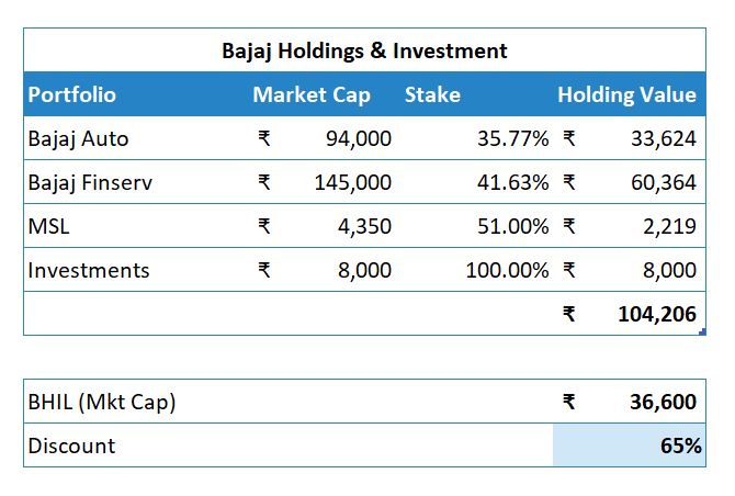 BHIL has a market cap of ₹ 36,600 crore, against its NAV of ₹ 1.04 lakh crore. The holdco discount is 65%.