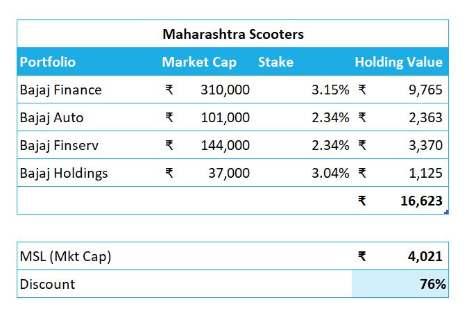 MSL has a market cap of ₹ 4021 crore, against its NAV of ₹ 16,623. The holdco discount is 76%.